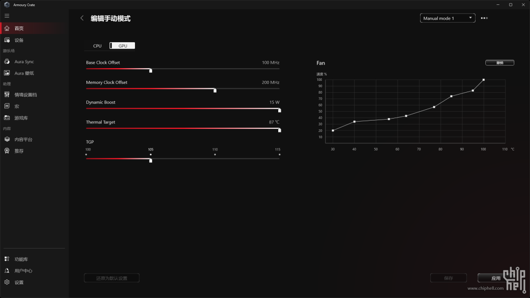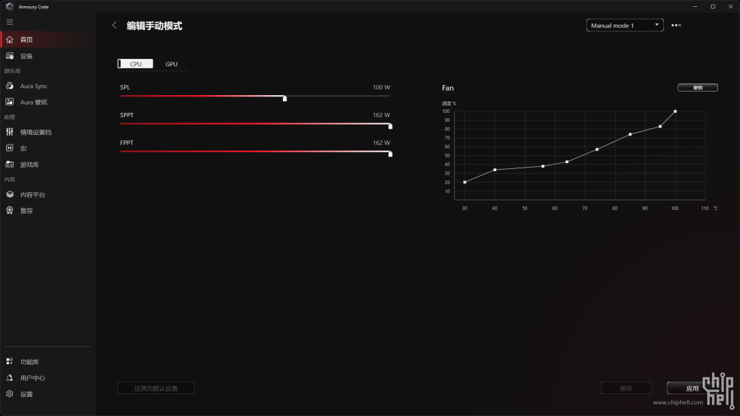 编辑手动模式,可以对CPU和GPU的功耗和频率等,以及对应的风扇转速进行设置,同时可以创建多个手动方案并保存.