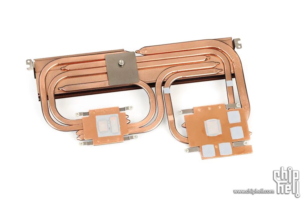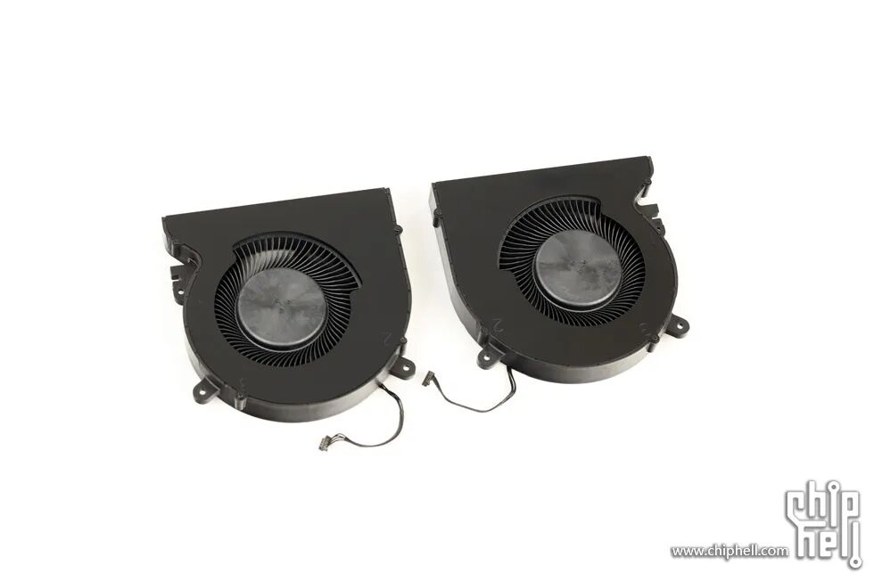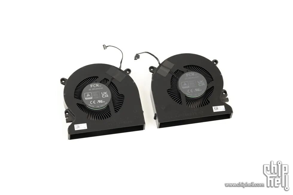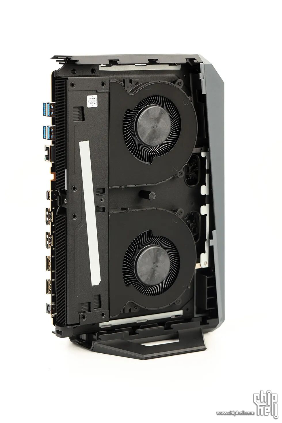 卸下左侧面板后,可以看到两个硕大的散热风扇和与之对应的散热模组.