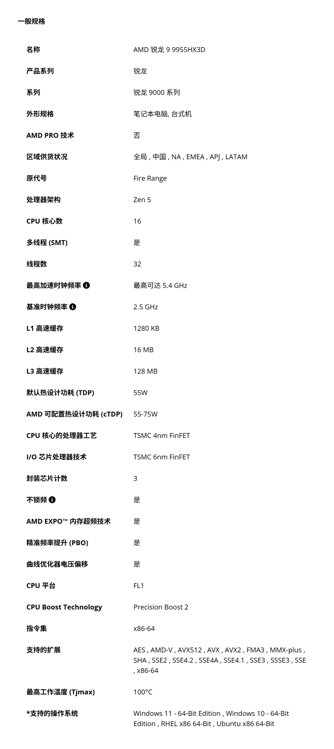 CPU规格一览,更多详情请前往AMD官网:https://www.amd.com/zh-cn/products/processors/laptop/ryzen/9000-series/amd-ryzen-9-9955hx3d.html