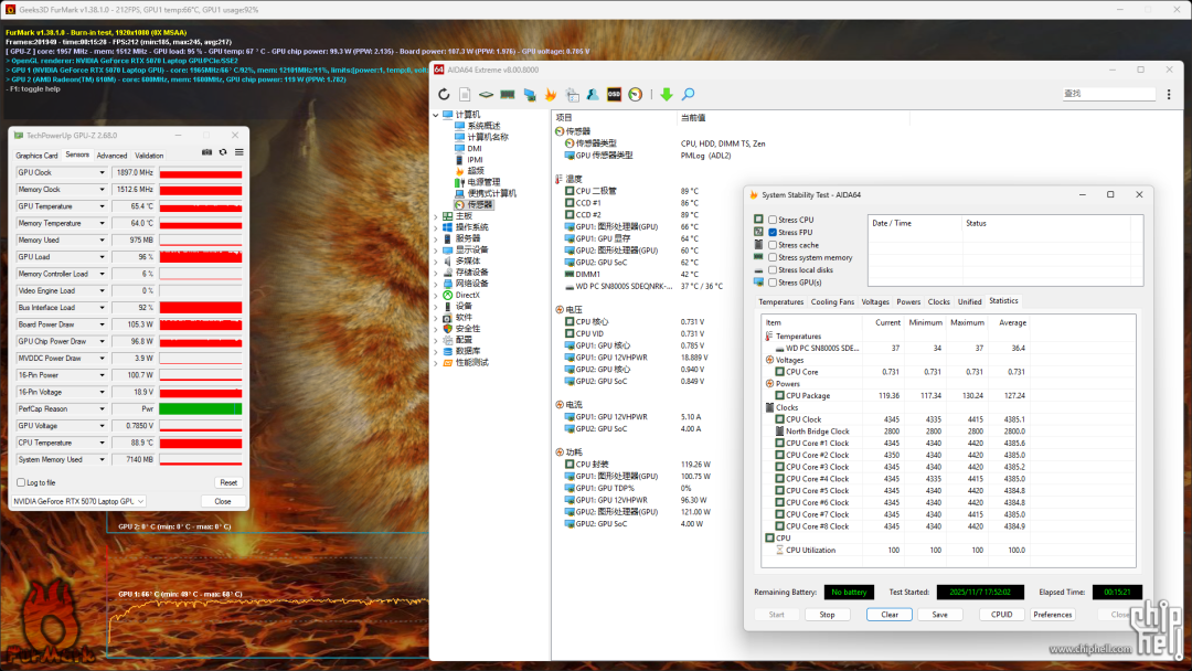 双烤(FPU+Furmark)满载15分钟后,CPU的温度为89摄氏度,频率约为4.34GHz,功耗为119.26W左右.GPU的温度为65.4摄氏度左右,频率为1897MHz,功耗为105.3W左右.