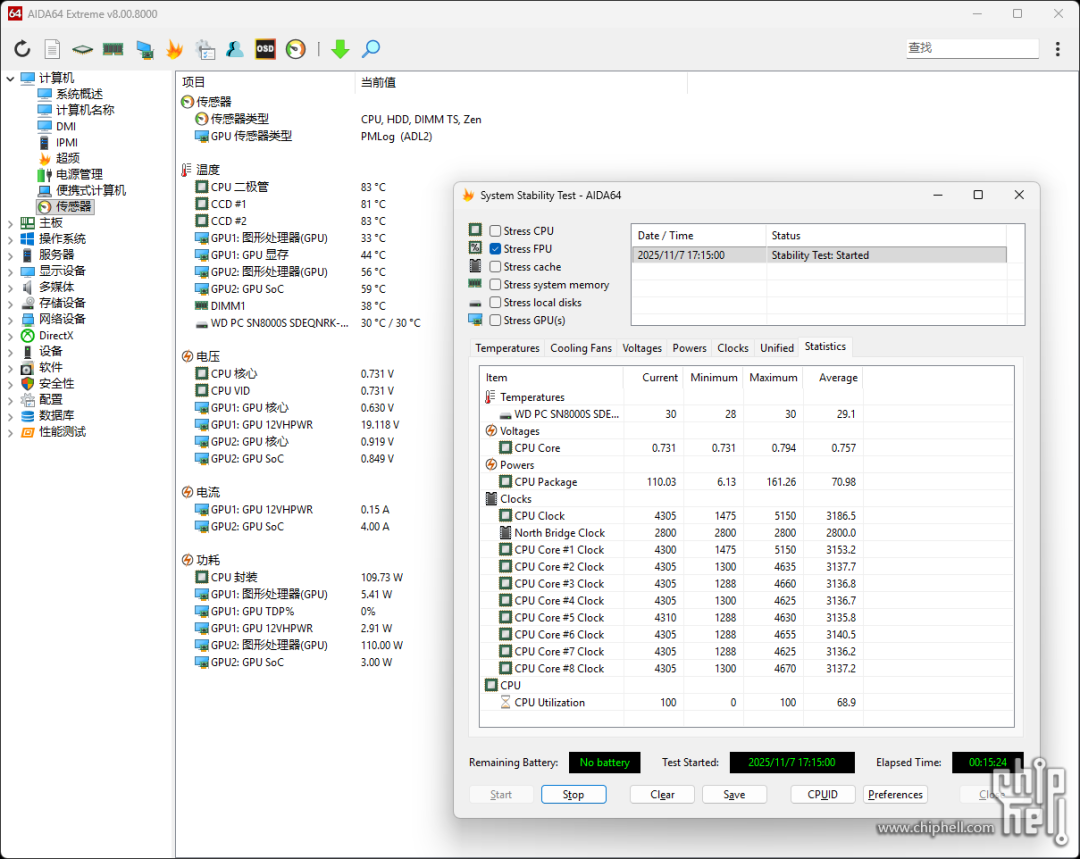 单烤FPU(AVX2)满载15分钟后温度达到了83摄氏度,温度控制一般.CPU频率维持在为4.31GHz左右,功耗为110W左右.