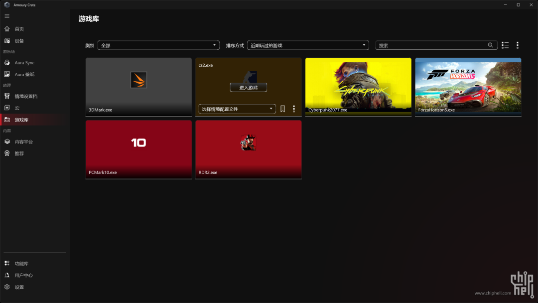 游戏库页面,可自动扫描添加游戏,并可针对每个游戏进行单独的情景模式选择.