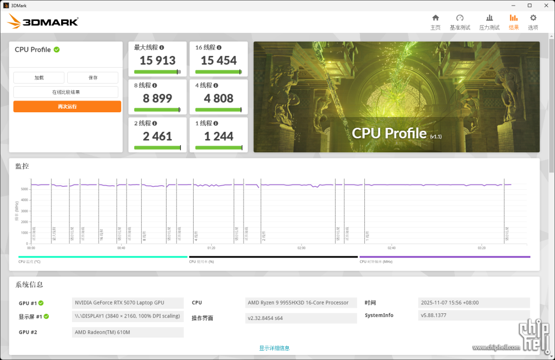 CPU为AMD Ryzen 9 9955HX3D,采用16核32线程设计,最大可睿频至5.4GHz.