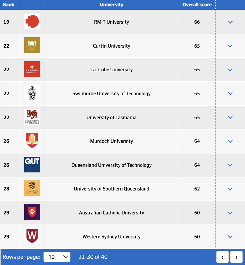 可以看到,有些非八大院校也闯入前十,说明澳洲本土评估体系非常重视教学质量、职业成果和学生满意度,并非排名只看“学校名气”。