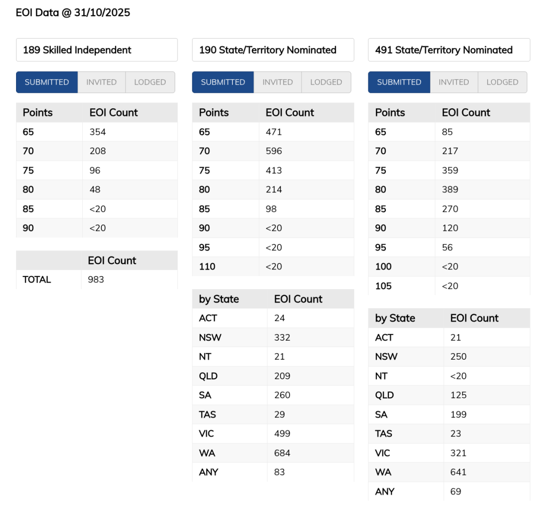 11月已经到来,澳洲各大移民专业情况如何?一起来看看移民局更新的截至10月31日的EOI数据,了解各条线目前的分数和申请人数!
