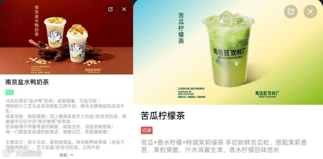 而马伍旺的新品则仍处于“猎奇营销”的浅层次,持续推出了南京盐水鸭奶茶、苦瓜柠檬茶等等新奇口味。虽然在短期内可以快速带来流量,但这些产品与其品牌理念严重脱节,且很难形成长期复购。