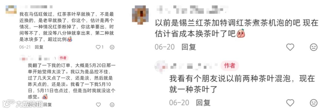 首先就是马伍旺产品品控不稳定导致的口碑反噬。在大众点评、小红书等平台上关于马伍旺“口味时好时坏”“雪顶融化得很快”“茶底太涩”的评价也不在少数,而这也侧面反映了因为马伍旺的迅速扩张而导致的产品标准不统一的问题。有些加盟店甚至出现了“减少茶底用量、加入过量冰块代替”的情况,这些产品以及管理上的问题都在不断地透支着消费者对品牌的信任。