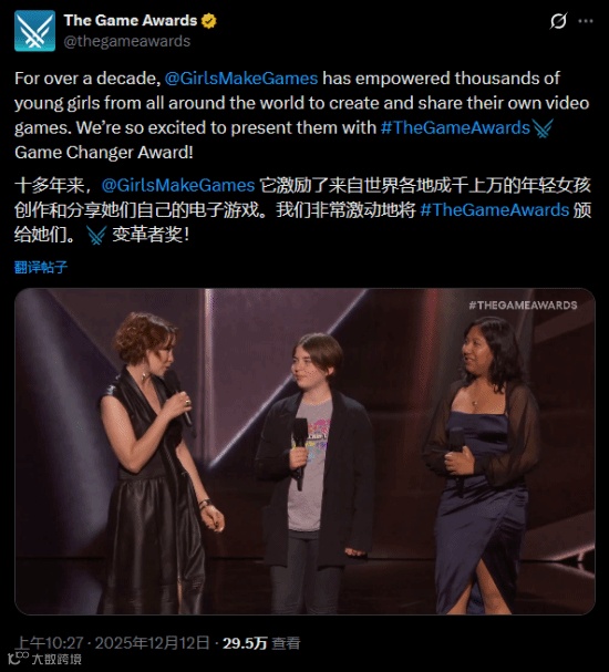 本届TGA将“游戏变革者奖”颁给了一个名叫“Girls Make Games”的组织,该奖项于2024年设立,用于表彰那些在游戏行业之外或超越传统游戏作品评价范畴的、有社会或行业积极影响的人士或团体。游戏变革者奖更像是一种 “荣誉奖/特别贡献奖”,并且不会事前公布提名让公众参与投票,而是选择在TGA上直接揭晓获奖得主。