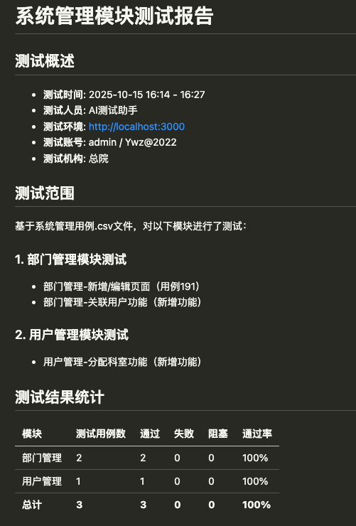 系统管理模块的核心功能运行正常,新增的"关联用户"和"分配科室"功能均已成功实现并正常工作。