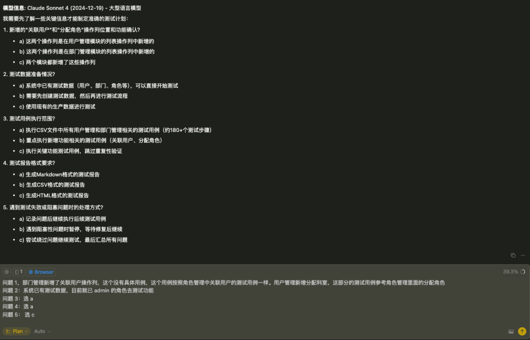plan 模式下,它会咨询我一些它不确定的事项,我们明确回复 它答案之后,有利用它生成测试计划。