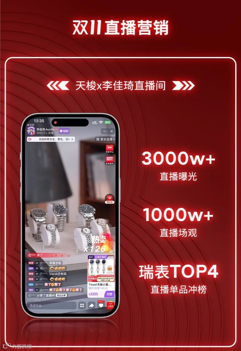 品牌店播在此次大促中表现卓越,取得销售额破百万的优秀战绩,不仅稳住其在手表眼镜行业TOP1的地位,更实现了渗透率的持续突破。同时,天梭与平台进行了更深度的建联,成为“天猫超级时刻”、“直播超前线”等核心资源的典型案例商家,充分借助主会场资源扶持政策,为品牌争取专属流量,有效提升整体转化效率,真正实现了品效合一的目标。