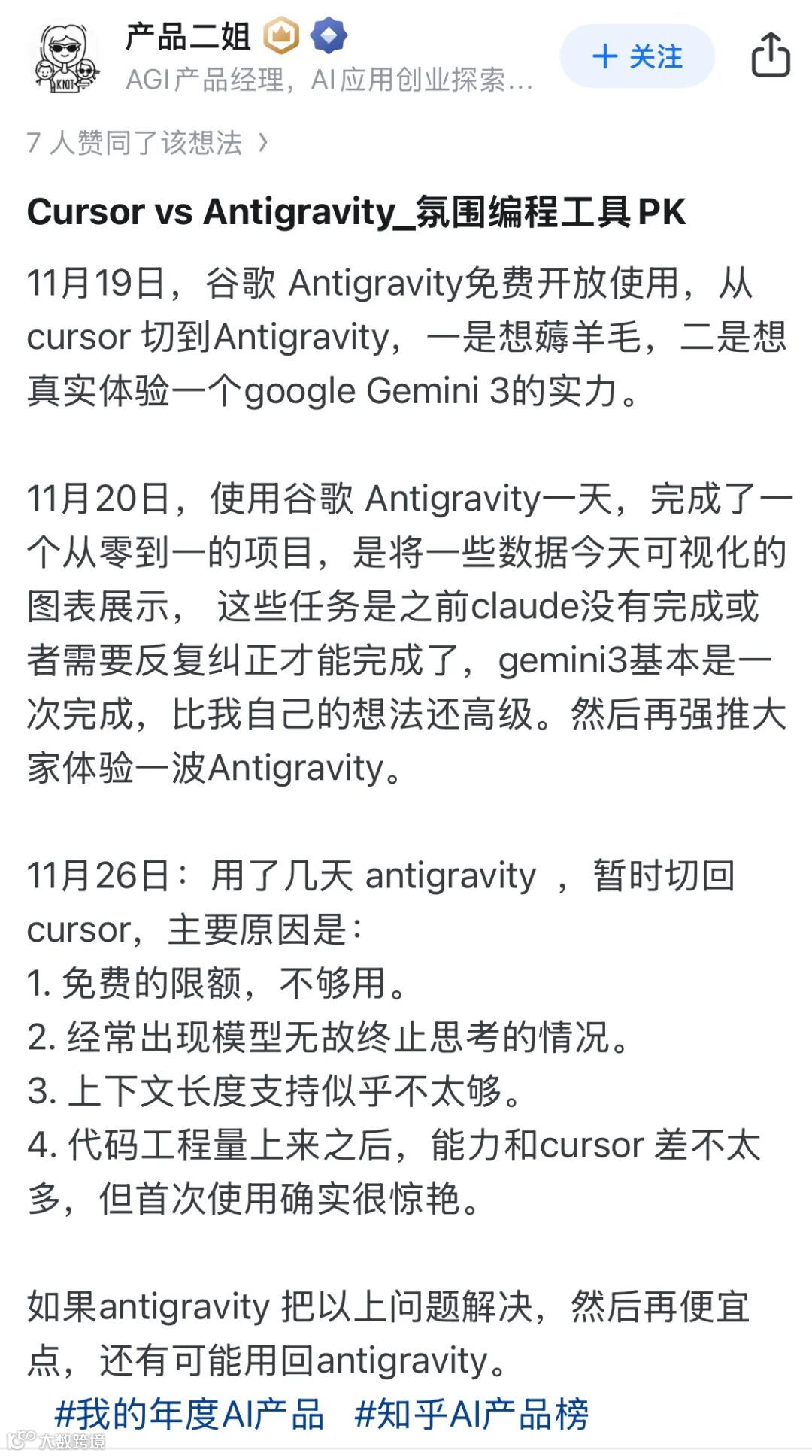 谷歌推出的 Antigravity 免费开放使用,具备 Gemini 3 的强大能力,吸引部分用户从 Cursor 切换尝试。但由于调用限额较严,实际使用中仍存在限制,目前不少开发者选择回归 Cursor。