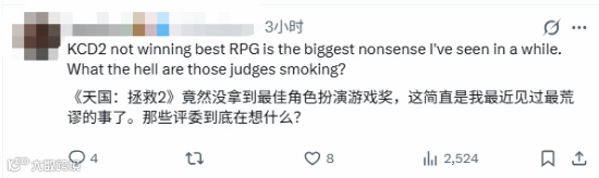 “明明《天国:拯救2》更值得拿最佳角色扮演奖!”