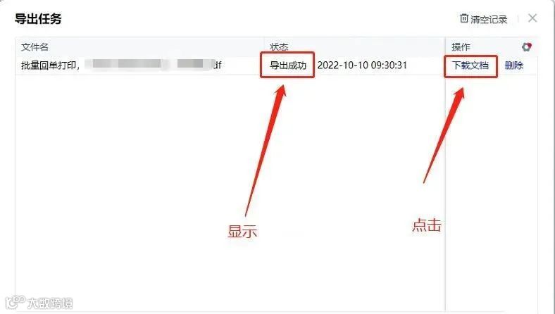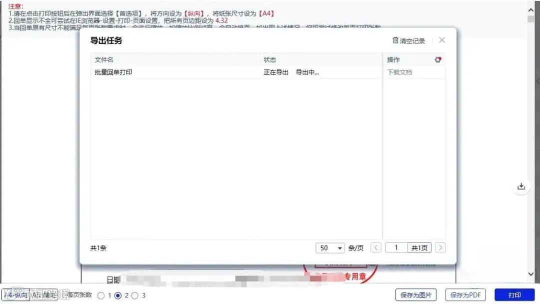 - 选择回单排版格式,点击“保存为PDF”,待状态显示“导出成功”后,点击“下载文档”并保存至本地[k]。