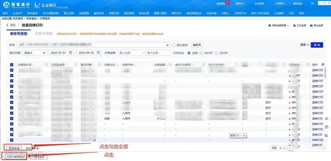 - 勾选所需回单(可使用“全部选择”),点击“打印/保存选中”[k]。