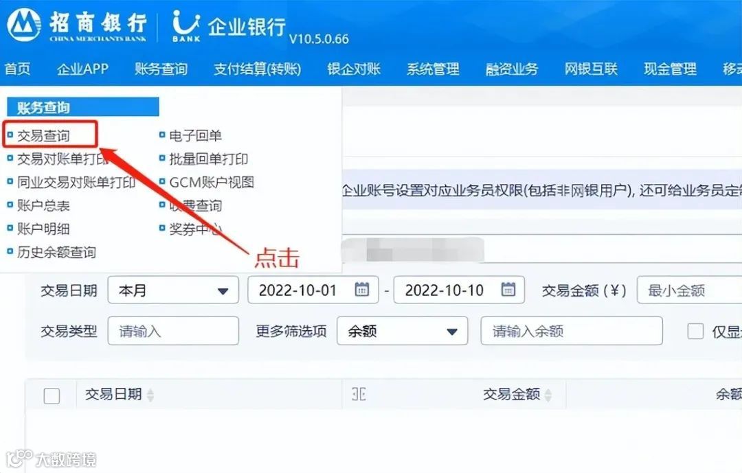 - 依次点击“账务查询”(部分界面显示为“账户管理”)→“交易查询”[k]。