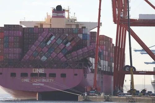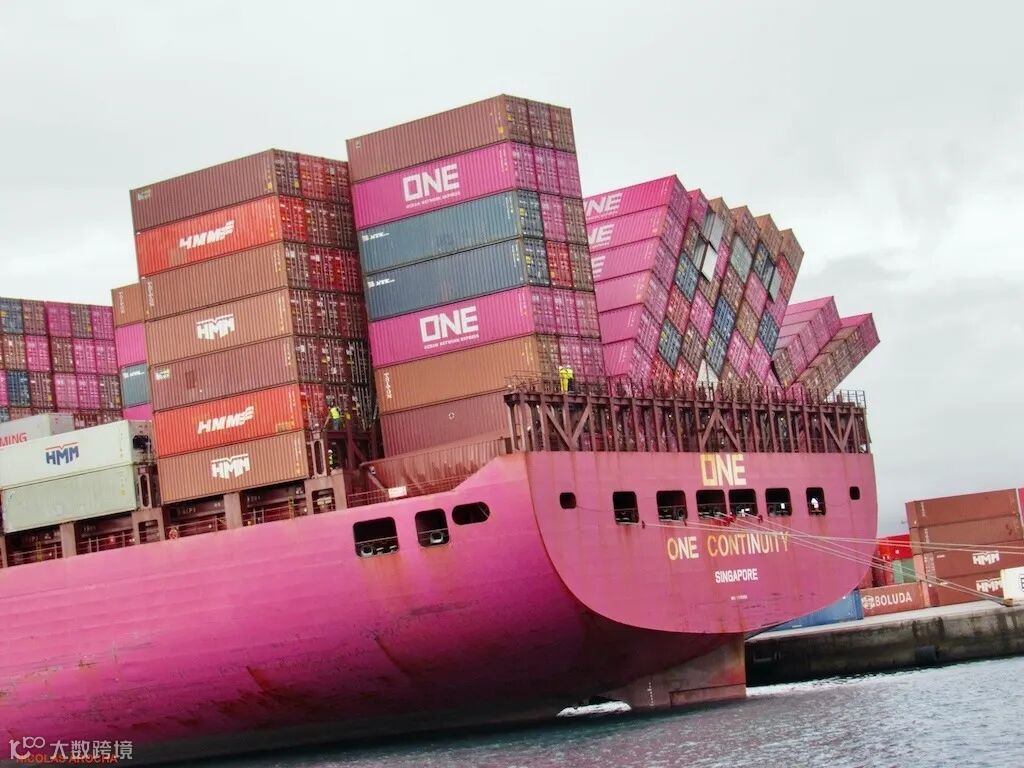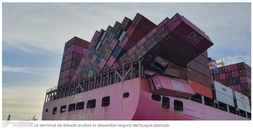 据壹航运援引信德海事最新消息:日本集运公司Ocean Network Express(ONE)旗下集装箱船“ONE CONTINUITY”在加那利群岛以南遭遇巨浪,导致约45只空集装箱落海,随后紧急驶入西班牙拉斯帕尔马斯港避险。