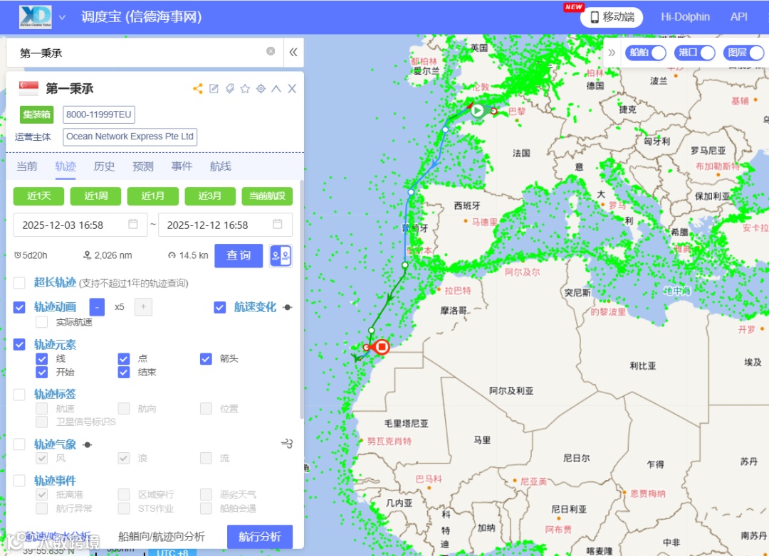 事发时,该轮正执行从法国勒阿弗尔至新加坡的航次。有理赔材料指出,其在通过比斯开湾时已遭遇恶劣海况并出现空箱落海,不排除堆载稳定性在后续航程中持续恶化。具体事故时间线与责任认定仍有待进一步调查。