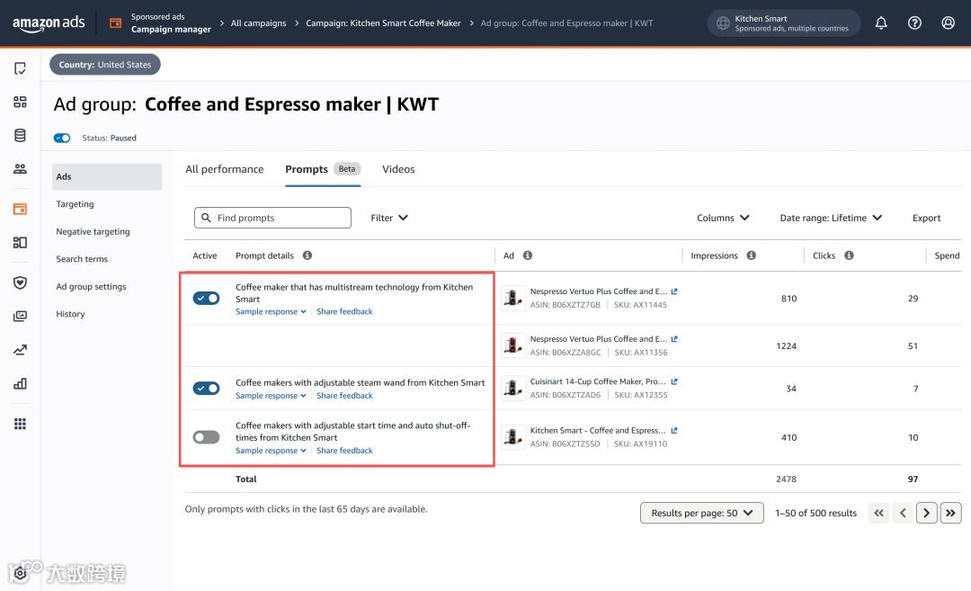 亚马逊广告后台近期上线一项名为“提示词 Prompts(测试)”的全新投放入口。