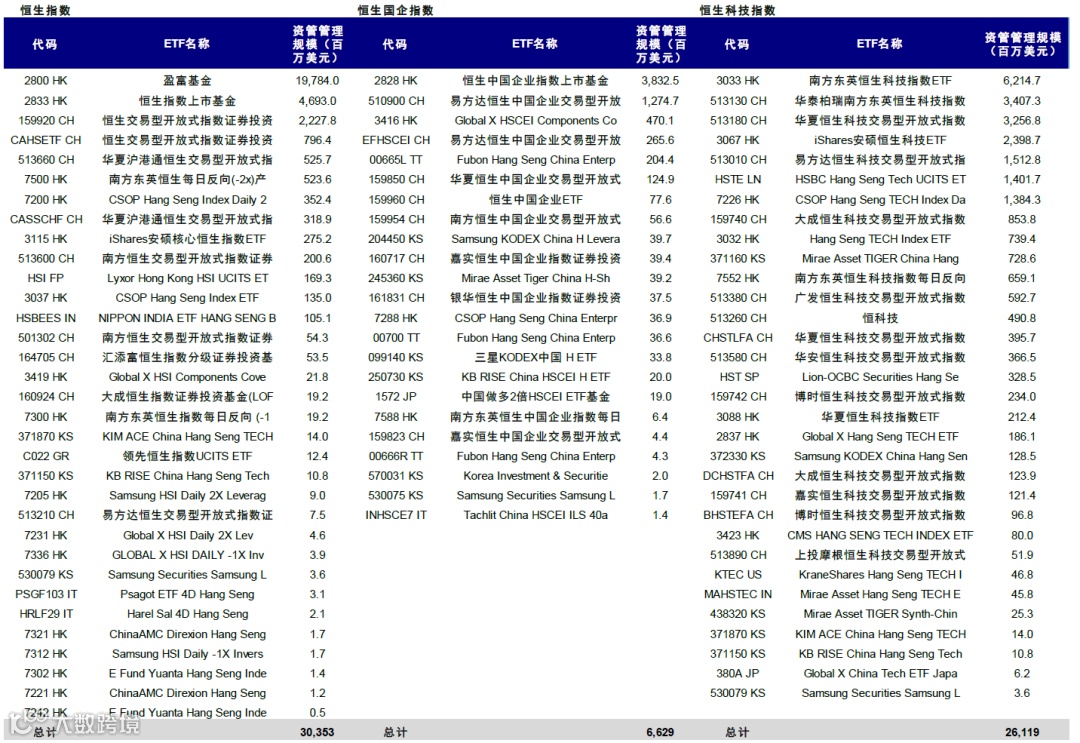 图表:追踪恒生指数、恒生国企指数和恒生科技指数的ETF资金规模