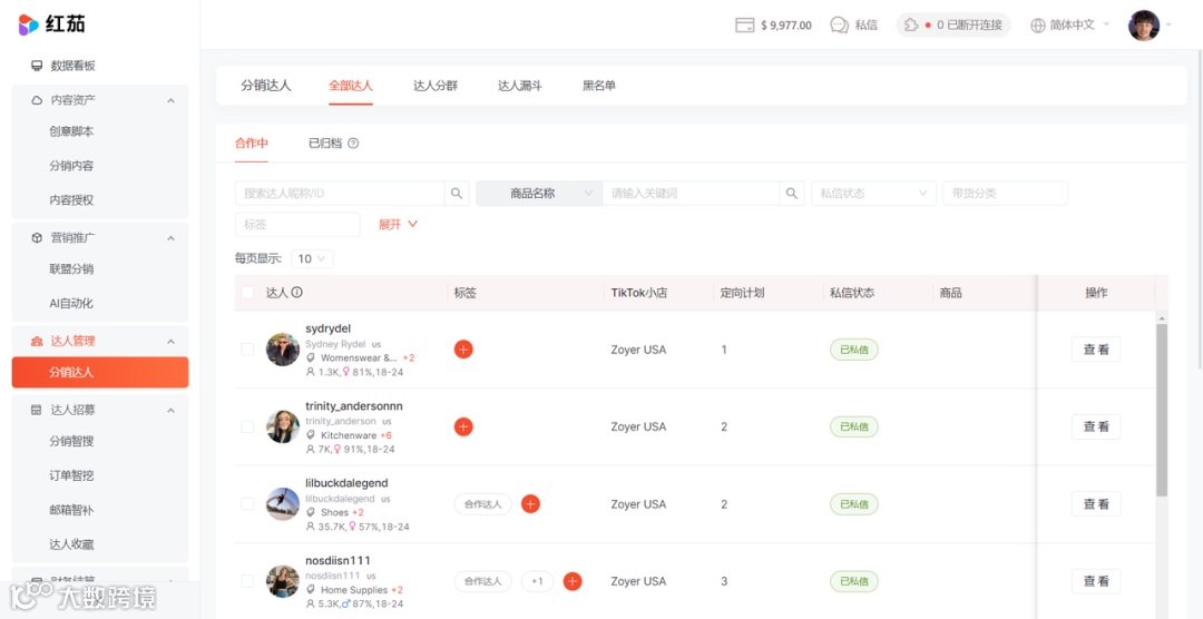 更关键的是,红茄Crevideo有一个非常强大的自动化功能,这是市场上插件类产品都没有的。你可以创建定邀计划、私信、定邀计划加私信三种形式的自动化任务,整个达人建联、沟通、申样、寄样、视频发布、出单情况这些流程全部自动化,你只需要监控就可以了,大大减少了人工的工作量和成本。