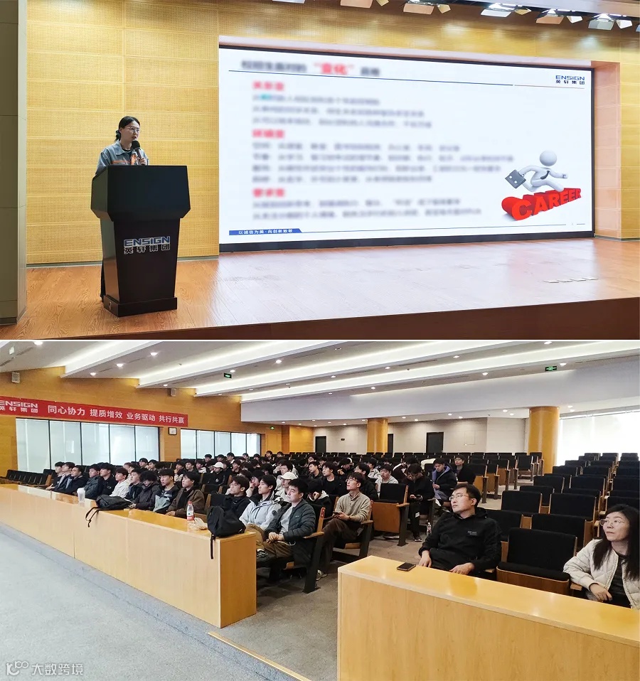 人力资源部对校招生培养规划——扬帆计划进行了详细介绍。“扬帆计划”作为公司的校招人才培养项目,为校招大学生设计了一条清晰的培养路径,涵盖入职引导、导师带教、轮岗实践及陪伴式成长等全方位保障,让在场的同学们看到了在英轩清晰的职业发展路径。
