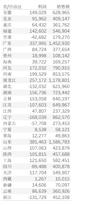 拖动一个省/自治区的字段到行这一列,然后再双击度量字段,它会混合度量名称与度量值并展示出来,然后再筛选器里筛选出利润和销售额即可。