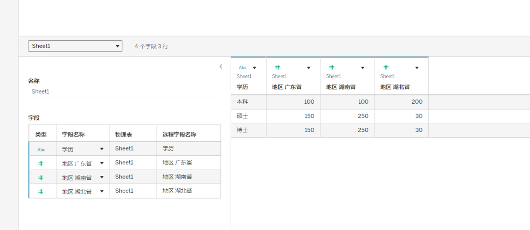 那么这三张表,你导入到Tableau中后新建并集,那就会创建一个单表,并且这个表的内容如下: