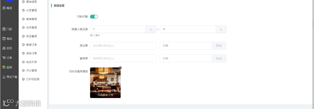 · 扫描餐桌码,设置就餐人数,系统自动显示茶位费、餐具费