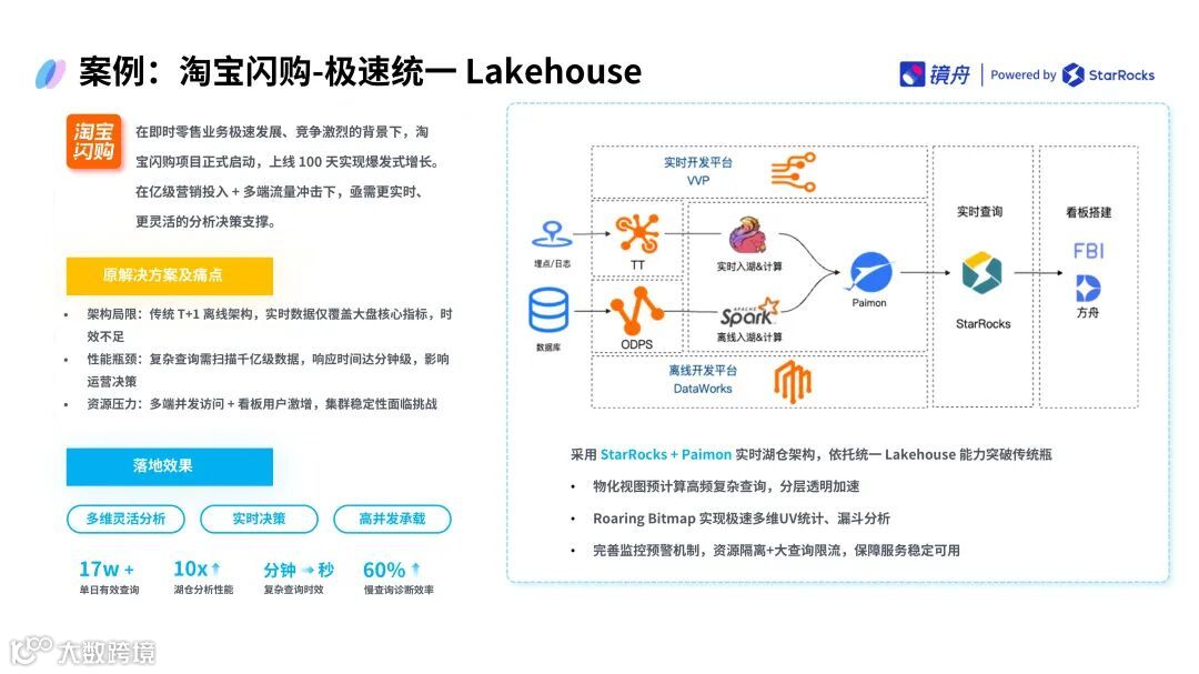 在竞争激烈的即时零售业务中,对实时决策、高并发查询和复杂多维分析的性能要求极高。淘宝闪购采用“Paimon + StarRocks”的实时湖仓架构,利用 StarRocks 对外表、分层物化视图的透明加速能力,实现了多维分析、UV 统计等复杂场景的极速响应,分析性能提升 10 倍、存储成本降低 60%,并稳定支撑每日超 17 万次的高并发查询。