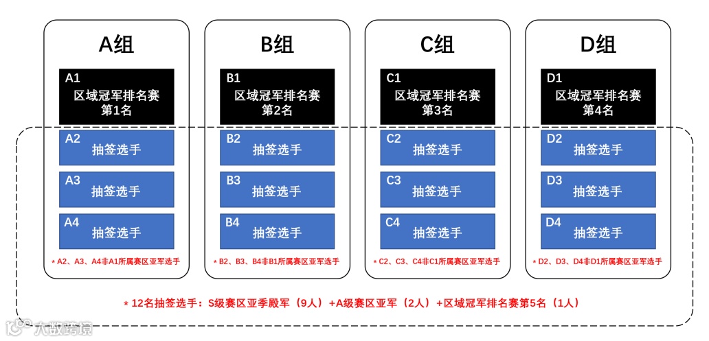 随机分组优先遵循同赛区冠亚不同组别的原则,如南部冠军分在A组,南部亚军抽到A组,则需要重新抽签,同赛区季、殿之间不受影响。