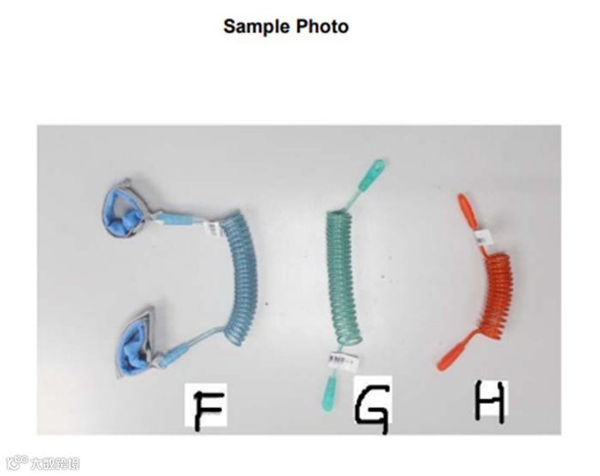 资质文件不可造假,不可P图,以下图儿童安全手绳为例,检测报告样品图( Sample Photo)中明显存在P图痕迹,字母”F“、”G“、”H“,明显不同。