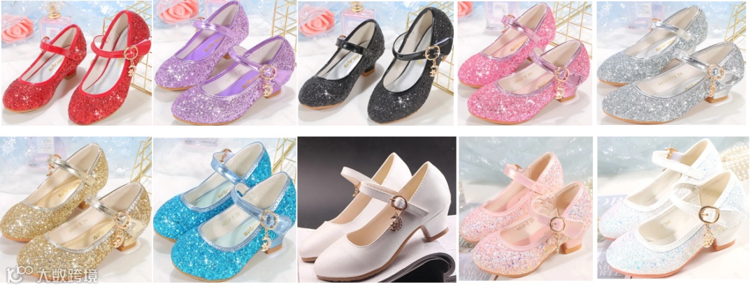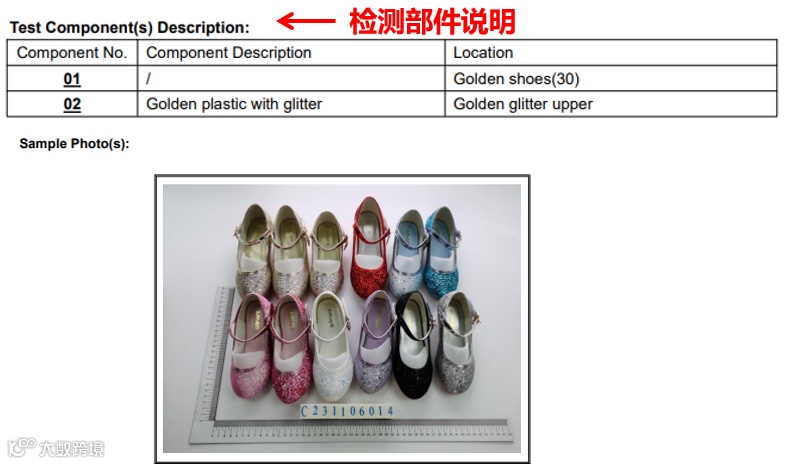 实际售卖商品图(sku图)女童高跟鞋有10个不同颜色款式(红色亮片款、紫色亮片款、黑色亮片款、枚粉色亮片款、银色亮片款、金色亮片款、蓝色亮片款、白色哑光款、粉色亮片款、白色亮片款。检测报告中测点以及检测样本图(Sample photo(s))并未包含sku图中全部款式,以 sku图中白色哑光款童鞋为例,在检测样品图中并未出现。