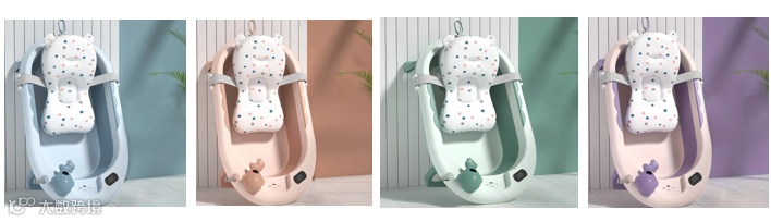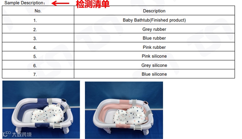 实际售卖商品图(sku图)婴幼儿浴盆有4个不同颜色款式(蓝色、粉色、绿色、紫色)。检测报告中测点(1-7):婴儿浴缸(成品)、灰色橡胶、蓝色橡胶、粉色橡胶、粉色硅胶、灰色硅胶、蓝色硅胶,以及检测样本图(Test Sample Photo)并未包含sku图中绿色、紫色2个款式。