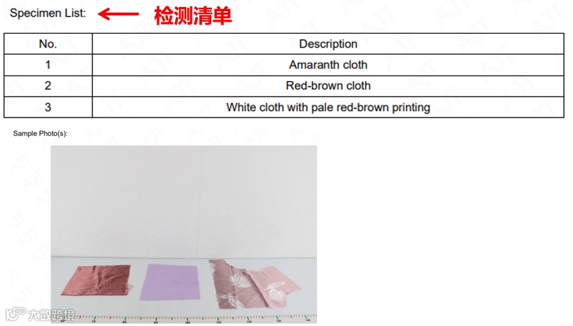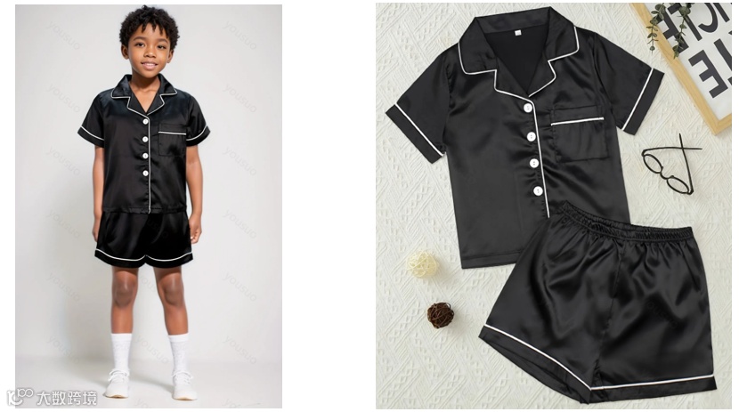 实际售卖商品图(sku图)男童睡衣为1个黑色款式,检测报告样品清单(1-3)紫红色布、红棕色布、白布带淡红棕色印花,以及检测样本图(Sample Photo(s))并未出现黑色款式睡衣。
