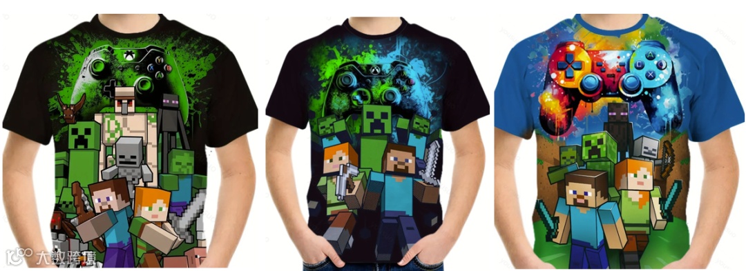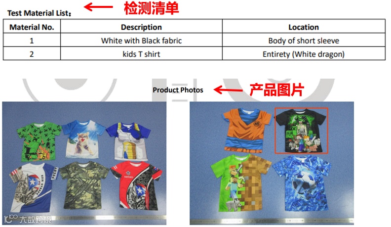 实际售卖商品图(sku图)男童T恤有3个不同颜色款式,共同点每件衣服都有“游戏手柄”。检测报告中测点以及检测样本图(Sample Photo)并未包含sku图中3个款式,产品图片中仅包含其中一款黑色手柄,其余2款并未出现。