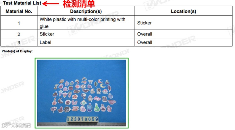 实际售卖商品图(sku图)贴纸有多个不同颜色款式。检测报告中测试材料清单:白色塑料多色印刷带胶、贴纸、标签,以及检测样本图(Photo(s) of Sample(s))并未包含sku图中款式,以sku图中南瓜系列为例,在检测报告样品中并未展示。