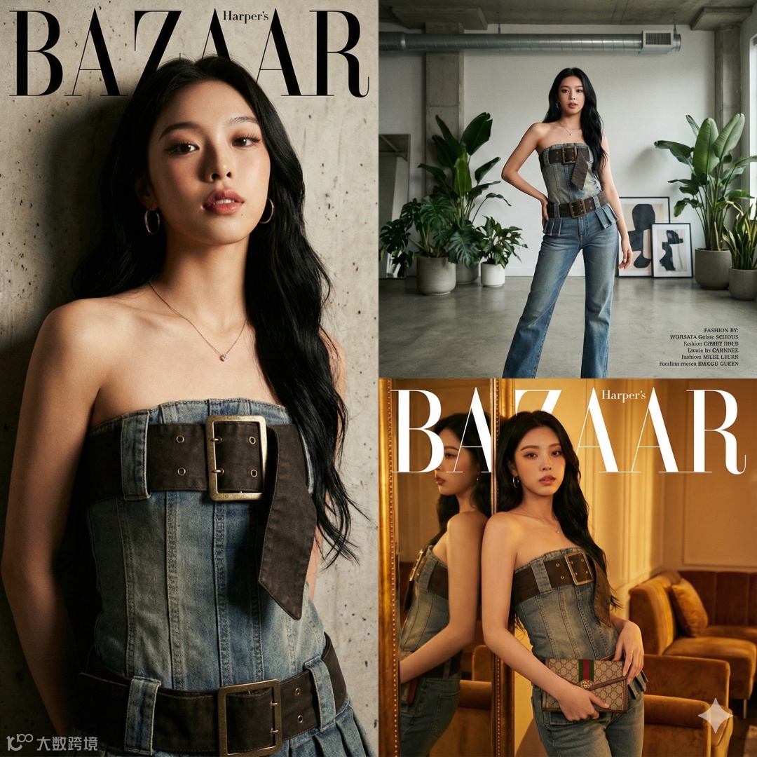将 Seedream 4.5 首次生成的亚裔女性形象作为输入,两模型分别生成《时尚芭莎》风格组图。Seedream 4.5 输出的人物辨识度高,服饰细节、神态连贯性及光影质感均保持统一;Nano Banana Pro 在人物复现与风格统一性方面存在明显断层。