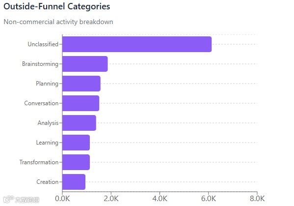 Petrovic将AI会话划分为42类意图,发现超六成活动处于购买漏斗之外,主要集中在以下场景: