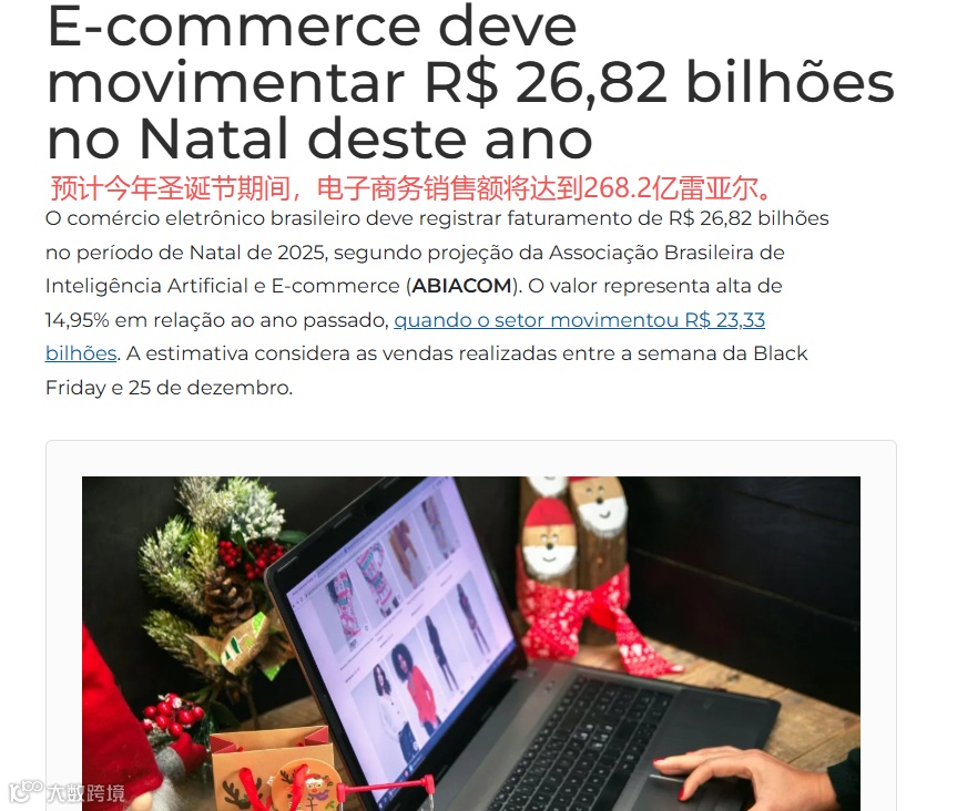 据巴西人工智能与电商协会(ABIACOM)最新报告,2025年圣诞购物季(黑五当周至12月25日)线上销售额预计达268.2亿雷亚尔(约合人民币375亿元),较2024年增长14.95%,增量达97.6亿雷亚尔[2]。