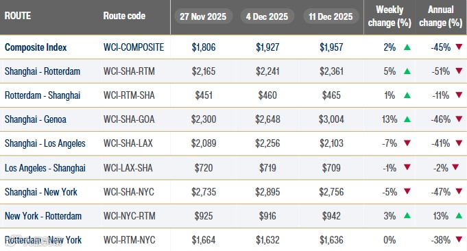 12月11日数据显示,德鲁里世界集装箱指数(WCI)本周上涨2%,达每40英尺集装箱1957美元,为连续第二周回升。