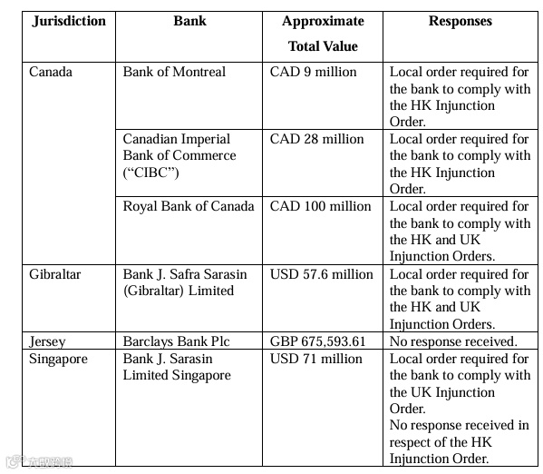 部分银行回复称,仅凭香港或英国法院命令无法作为冻结依据,须取得当地司法机构签发的正式命令方可执行;另有银行未予实质性回应。对此,香港高院认为,若不允许恒大在相关司法管辖区申请配套措施,现有冻结令在实务层面难以落实。