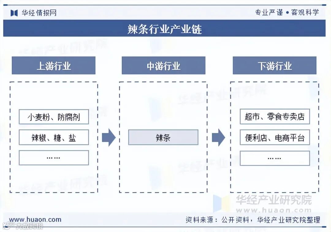 上游主要包括小麦粉、辣椒、糖、盐及食品添加剂等原材料供应;中游通过剪切、挤压、高温膨化等工艺制成半成品,再经调味、包装形成终端产品;下游销售通路涵盖超市、便利店、零食专卖店及电商平台。