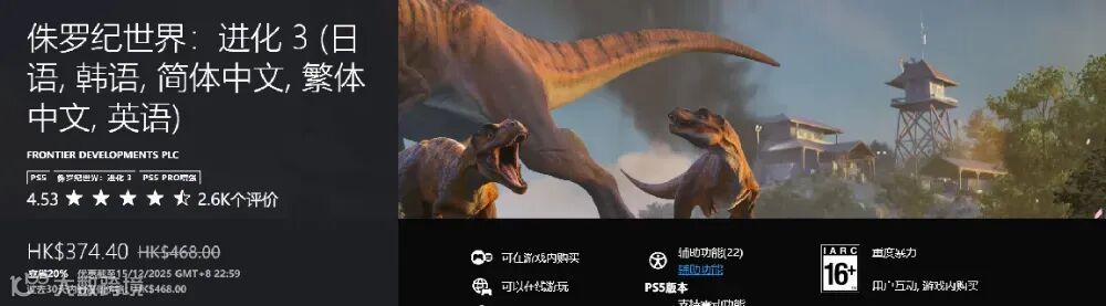 侏罗纪世界:进化 3 8折 HK$374.40(旧史低HK$468.00)