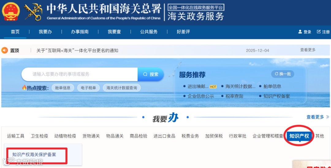 海关知识产权备案系统访问路径:海关政务服务——我要办——知识产权——知识产权海关保护备案
