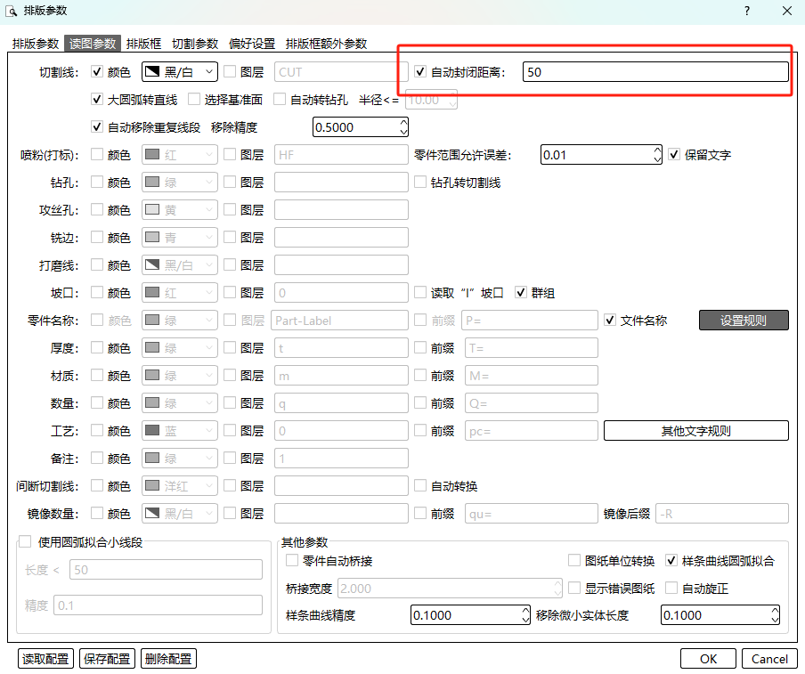 在SinoCAM套料软件的读图参数中勾选自动封闭距离,设置距离内未封闭的线会自动封闭。