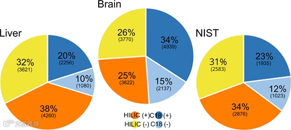 图2. 色谱和电离对同一样品经四种不同色谱和电离组合(C18(+)、C18(-)、HILIC(+) 和 HILIC(-))处理后获得的特征数量的影响。(Anton Ribbenstedt, et al. 2018)