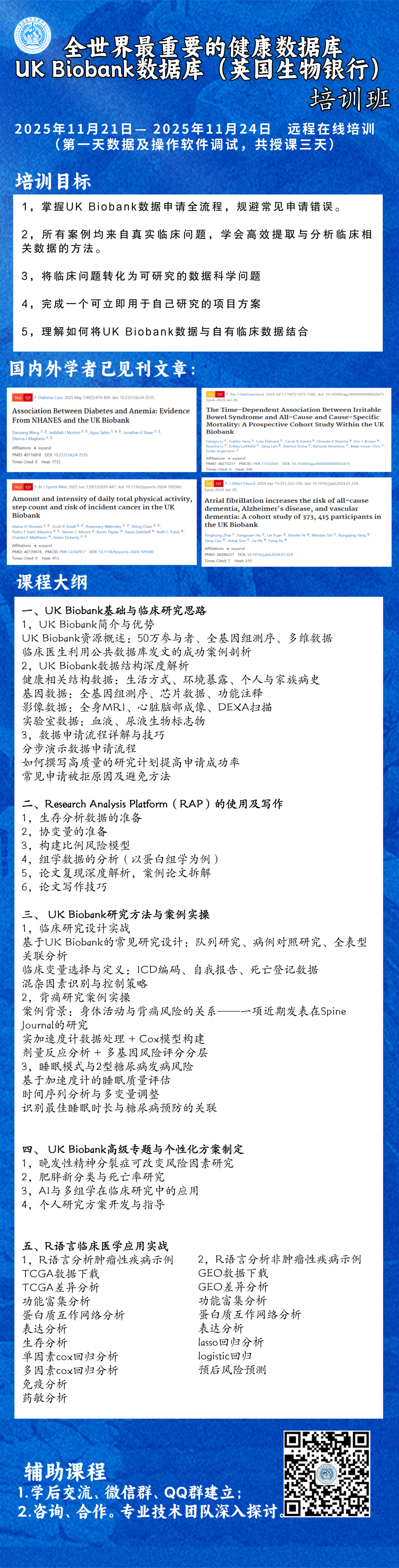 2,通过临床科研真实案例,帮助学员高效获取并分析UK Biobank与临床实践紧密关联的数据。
