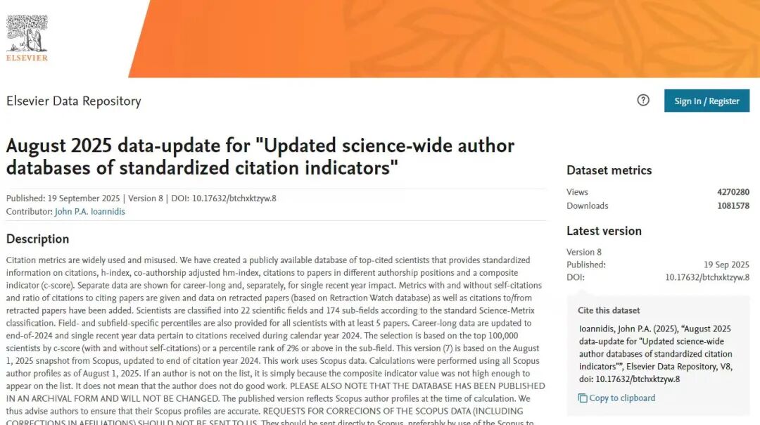 美国斯坦福大学与国际权威学术出版社爱思唯尔共同发布了2025年全球前2%顶尖科学家榜单。该榜单分为“终身科学影响力排行榜”和“年度科学影响力排行榜”两大维度,基于全球近700万名科学家的论文引用数、H指数等多项综合指标评估产生。