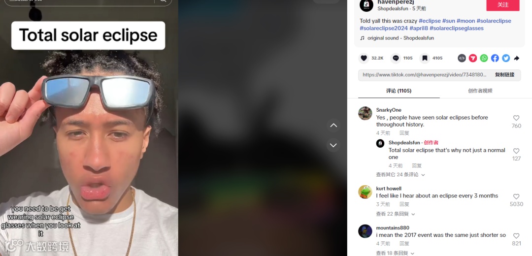 3月20日,TikTok上昵称为“@havenperezj”的博主发布了关于此次日全食的视频,视频中,博主通过图文搭配真人讲述的方式科普日全食的变化过程,随后引出观测时需要佩戴日食太阳镜做视力防护。
